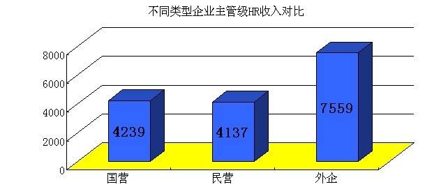 从企业类型上看,民营企业和国企的收入水平相差不大,做到主管级别的HR,中端收入水平均能达到4000,而外企在这部分的工资则非常惊人,超过了7500,基本上使国企和民营企业的一倍。这样的高工资自然和外企的高要求有着紧密联系,首先作为中层管理人才,主管级HR在外语和业务技能方面,必须有着超人水平;另外,外企的招聘压力和高节奏工作环境,也催生了主管HR令人欣羡的高工资。
