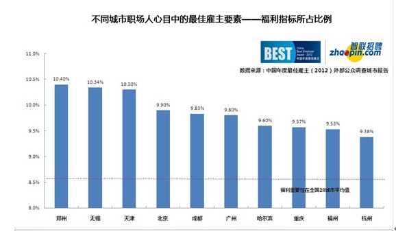 日前,由智联招聘、北京大学企业社会责任与雇主品牌传播研究中心联合发起的中国年度最佳雇主(2012)调查——28城市公众调查报告发布,其中郑州求职者最爱“福利”,高居28城市榜首。