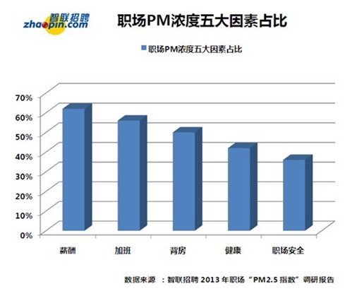 业内专家认为,职场出现跳槽率走高、活跃度加强等现象,与近年来日趋严重的“职场雾霾”有关。据日前智联招聘发布的《2013年职场“PM2.5指数”调研》显示:薪酬、加班、背房、健康和职场安全感成为职场人“最不满”的五大要素。