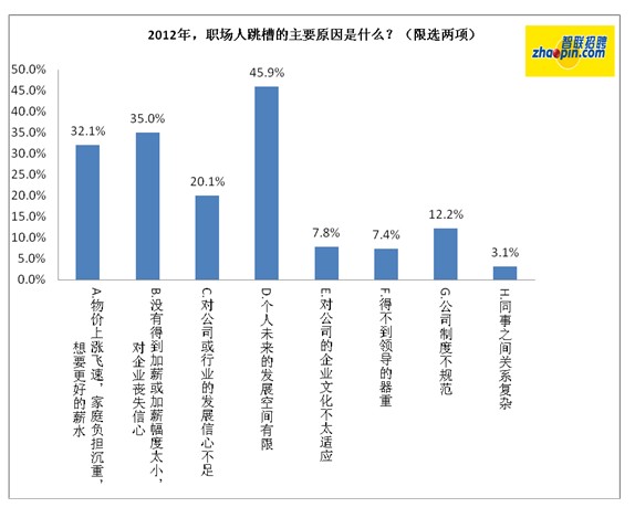 飞速上涨的物价和没有得到满意的加薪是影响职场人跳槽的两大原因,比例分别达到了32.1%和35%,分别排在第三和第二位。CPI持续上涨带来的生活成本的增加,从而导致职场人的生活及心理压力剧增,由此人们无疑对于薪酬的涨幅也有着较高的预期。如何在CPI和薪酬涨幅之间找到平衡点,是考核企业HR部门的一大难题。