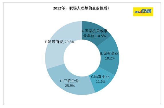 智联招聘调查显示,三资企业依然排在职场人青睐的企业性质首位,比例为25.9%。其次是国有企业,比例为18.2%。但同时调查显示,近三成职场人表示“随遇而安”,不再关注企业性质,这与此次调查中四成的85/90后不无关系。