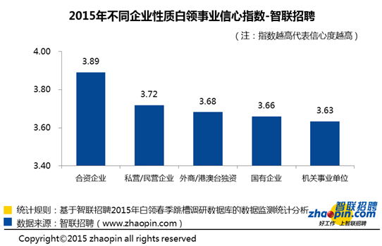 智联招聘调查发现,合资企业的白领对2015年事业表现出最高的信心度指数,高达3.89。最低的为机关事业单位,仅为3.63。另外为国有企业也较低,为3.66。希望2015年相继出台的深化国企改革、政府/机关事业单位员工薪资福利调整,及组织变革,能为这部分白领增强事业信心度。