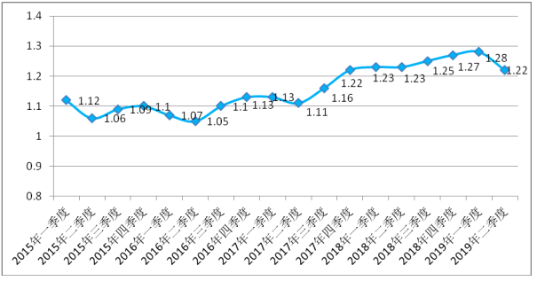 图1:2015年二季度-2019年二季度岗位空缺与求职人数比率变化趋势