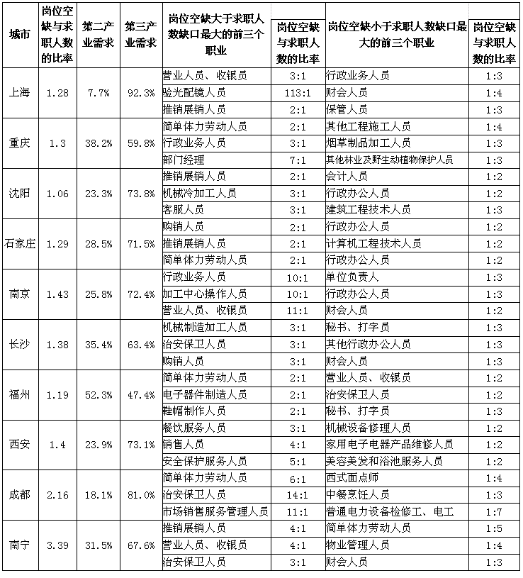 五、全国十大城市岗位需求和求职排行榜显示,简单体力劳动人员、推销展销人员、营业人员、收银员、治安保卫人员、购销人员、行政业务人员等职业的用人需求较大,财会人员、行政办公人员、秘书、打字员、保管人员等职业的用人需求相对较小。(见附表)