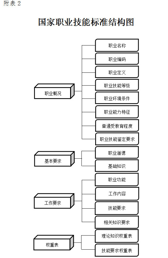 日前,人社部办公厅颁布中式烹调师等26个国家职业技能标准(见附表1)。国家职业技能标准是在职业分类的基础上,根据职业活动内容,对从业人员的理论知识和技能要求提出的综合性水平规定。它是开展职业教育培训和人才技能鉴定评价的基本依据(国家职业技能标准结构图见附表2)。