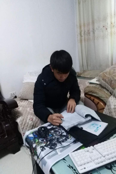 余光杰同学春节期间除了当志愿者守护村口,闲暇时间还抽空学习。