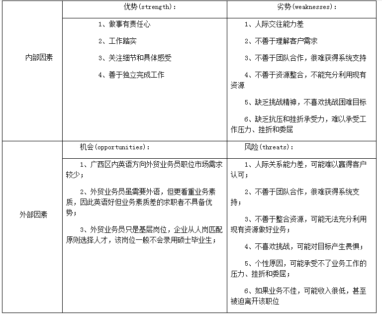 为了让小刚能够通过客观评估做出理性的生涯抉择,就业指导专家使用SWOT分析法,梳理了从事外贸业务员的优势和劣势、机会与风险: