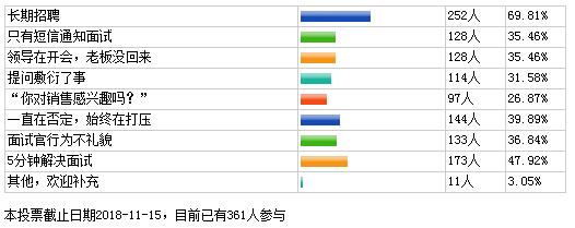 最近前程无忧做了关于“哪些情况会让你觉得这家公司没诚意招人”这一调查,结果发现,排名第一位的是“公司长期挂着招人广告”,“面试五分钟就草草结束”列位第二,“一直被否定打压”排在第三位。另外“面试官不礼貌”、“短信通知面试”等行为也被网友们视为没有诚意的行为。具体投票数据见下图。