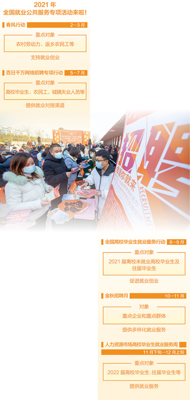 日前,人社部公布2021年全国就业公共服务专项活动清单,清单上的就业援助月、春风行动、民营企业招聘月、百日千万网络招聘专项行动等,有的面向农民工,有的聚焦高校毕业生,有的专门针对残疾人,1至12月,月月有活动,日日有服务。