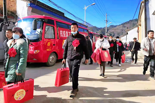 2月19日,陕西凤县142名务工人员统一佩戴口罩,在工作人员的引导下,登上“返岗复工直通车”,踏上了返岗旅程。