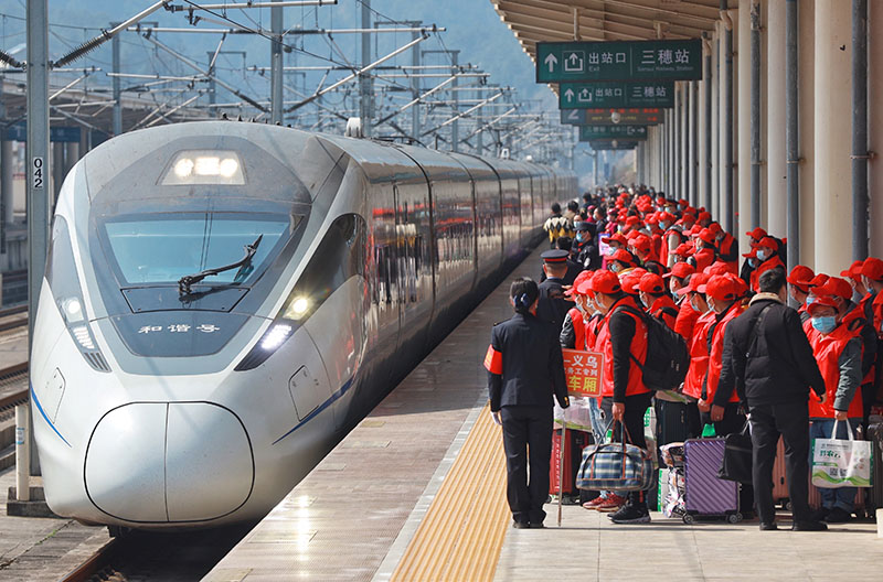 2月20日,务工人员在三穗站准备登上动车。当日,500余名贵州省黔东南苗族侗族自治州锦屏县务工人员在三穗站搭乘2021年贵州首趟务工专列G2336次列车前往浙江义乌。
