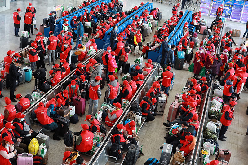 2月20日,务工人员在三穗站候车。当日,500余名贵州省黔东南苗族侗族自治州锦屏县务工人员在三穗站搭乘2021年贵州首趟务工专列G2336次列车前往浙江义乌。