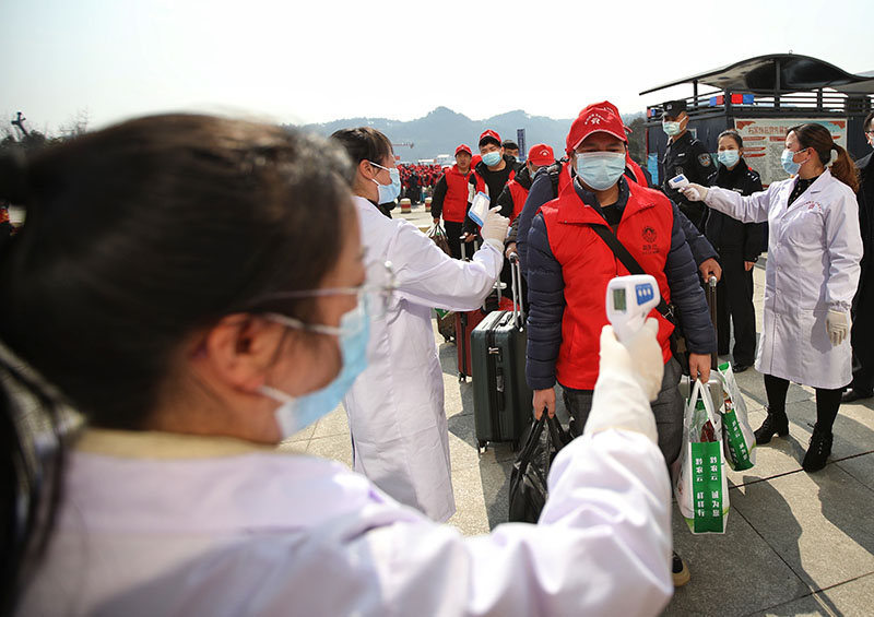 2月20日,务工人员在三穗站外测量体温。当日,500余名贵州省黔东南苗族侗族自治州锦屏县务工人员在三穗站搭乘2021年贵州首趟务工专列G2336次列车前往浙江义乌。