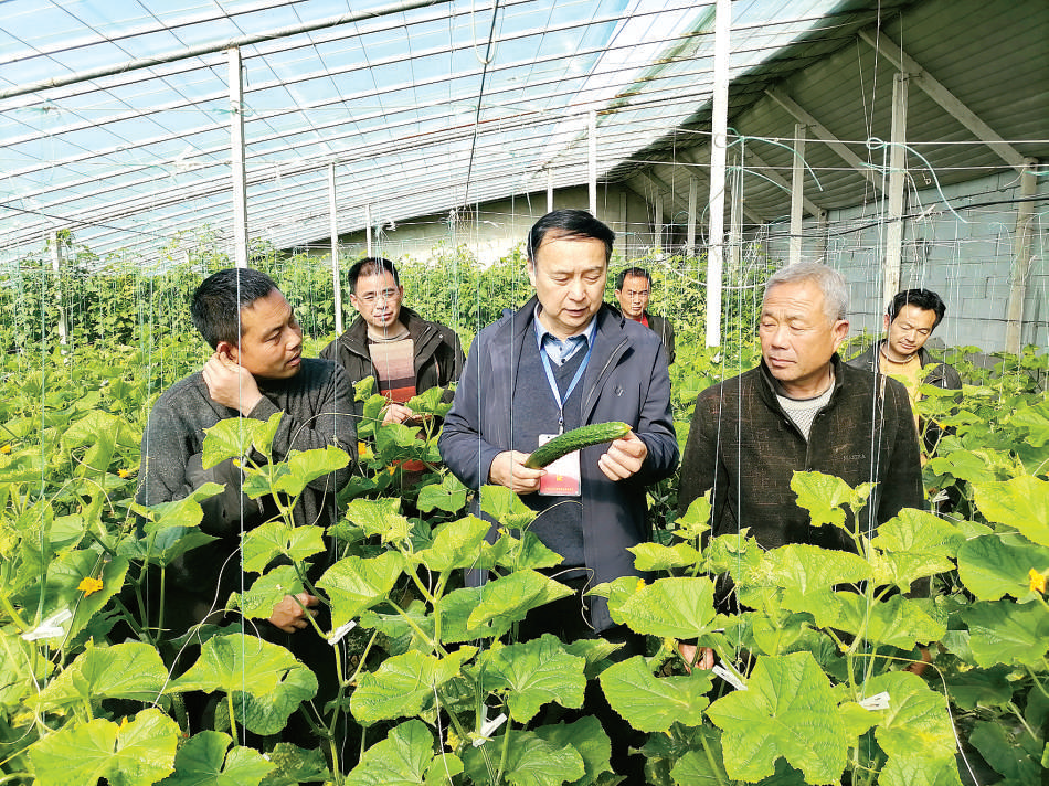 日前,安徽省农科院园艺所刘才宇研究员(中)向皖北泗县虹乡种植大户推广刚刚获批的国家发明专利“蔬菜水肥(药)一体化技术”。这一技术可实现作物整个生育期不需要人工施肥打药,大大降低了规模化种植的用工成本,受到群众欢迎。
