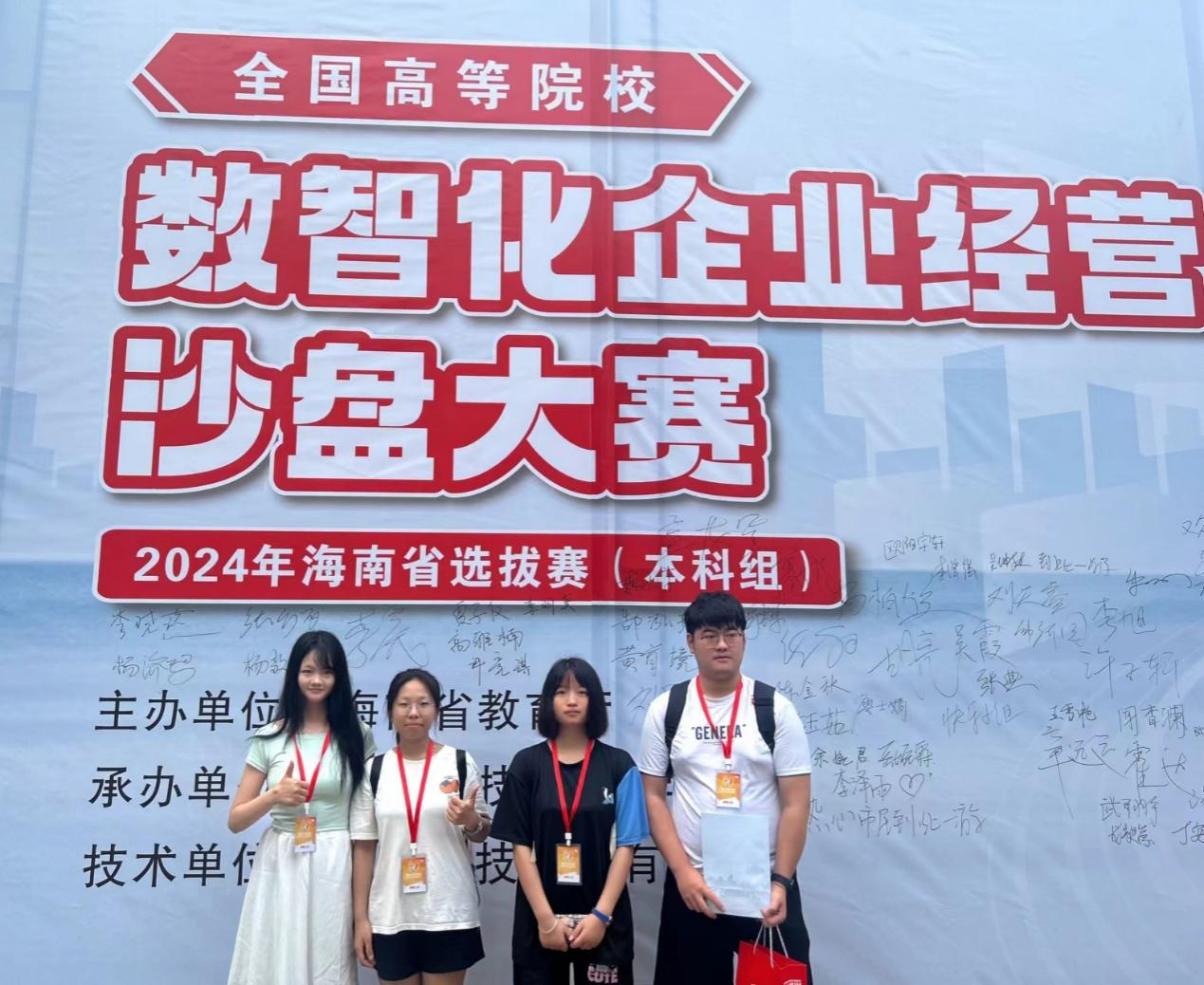 何婷(左起第二)和团队参加参加2024年数智化企业经营沙盘大赛海南省选拔赛(本科组)