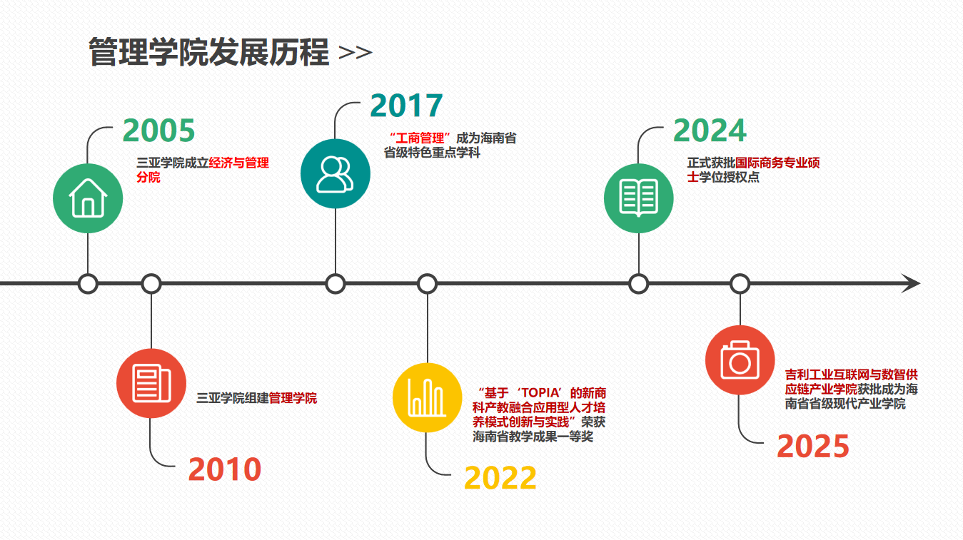 三亚学院管理学院始于2005年的三亚学院经济与管理分院,是三亚学院最早设置的二级学院之一。2010年,学校在经济与管理分院的基础上,组建管理学院。自2010年建院以来,已累计为社会输送管理类人才12204人。目前,学院拥有工商管理、管理科学与工程2个一级学科,下设工商管理、人力资源管理、物流管理、供应链管理、市场营销(数字营销)、跨境电子商务、工程管理(建筑数字技术与造价)等七个本科专业。2024年,学院正式获批国际商务专业硕士学位授权点,成为琼南地区规模较大、实力较强、特色鲜明、颇具影响力的管理类高水平应用型人才培养的重要基地之一。