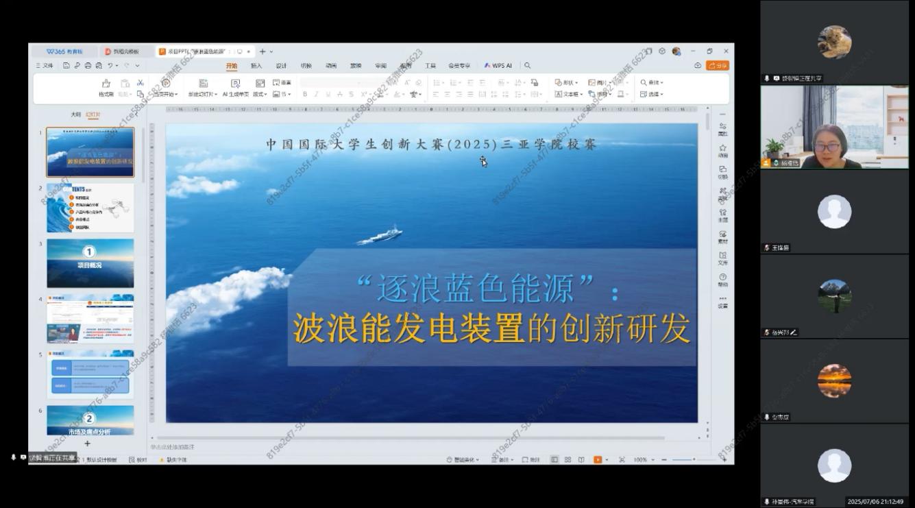 6 月 17 日下午,2025 年中国国际大学生创新大赛三亚学院校赛决赛在东区书明楼 C101 智慧教室圆满收官。我院杨雅恬老师与新能源与智能网联汽车学院贾老师、孙老师共同指导的跨学院学生团队,新能源与智能网联汽车学院岳同学担任队长的《逐浪蓝色能源——波浪能发电装置的创新研发》项目,以高教主赛道校赛一等奖的佳绩顺利出线,成功晋级海南省赛。