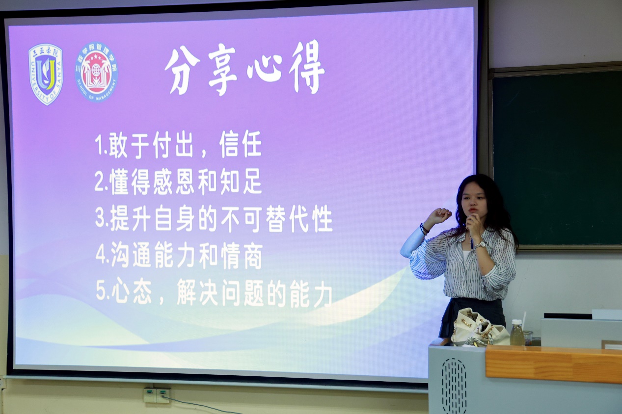 分享会伊始,曹颖便以自己在管理学院的求学时光为切入点,瞬间拉近与新生的距离。“曾经我也和你们一样,坐在台下聆听学长学姐的分享,满心憧憬着自己的大学生活。”她面带微笑的话语,让现场氛围迅速变得轻松亲切。