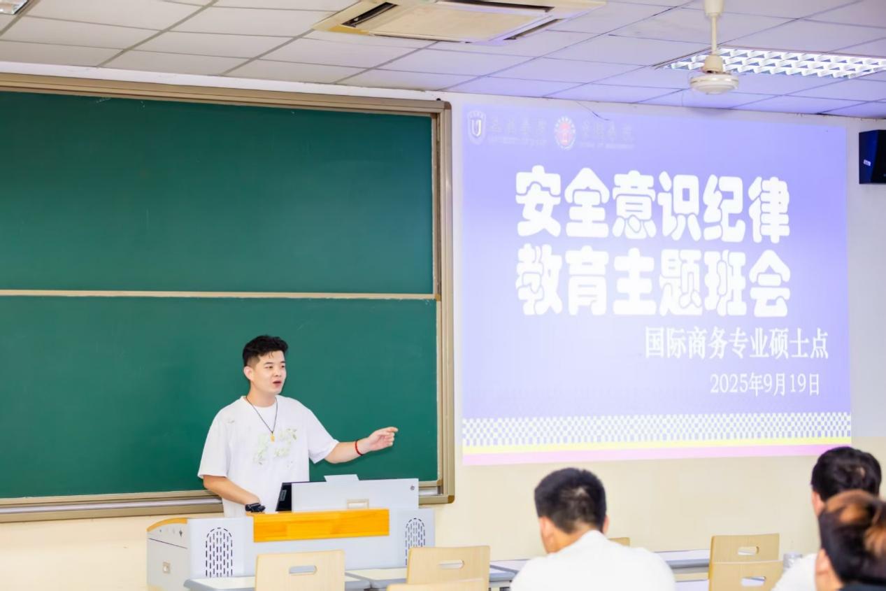 为进一步强化学生安全防范意识,规范日常行为纪律,营造平安、有序的学习生活环境,9月19日下午,在5西101管理学院国际商务专业硕士研究生组织召开“安全意识纪律教育”主题班会。