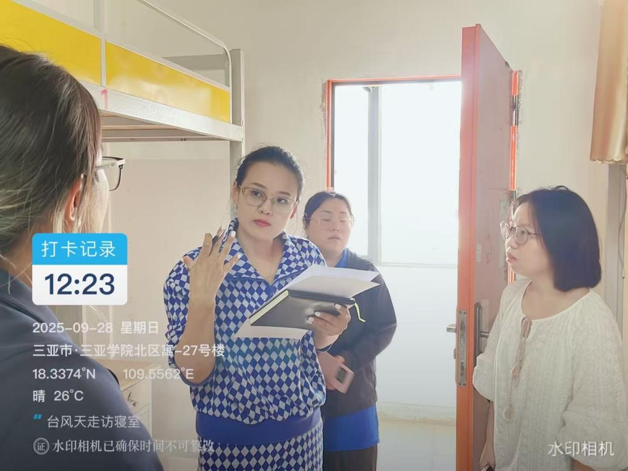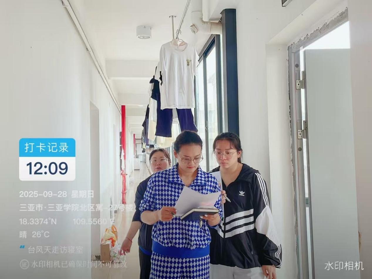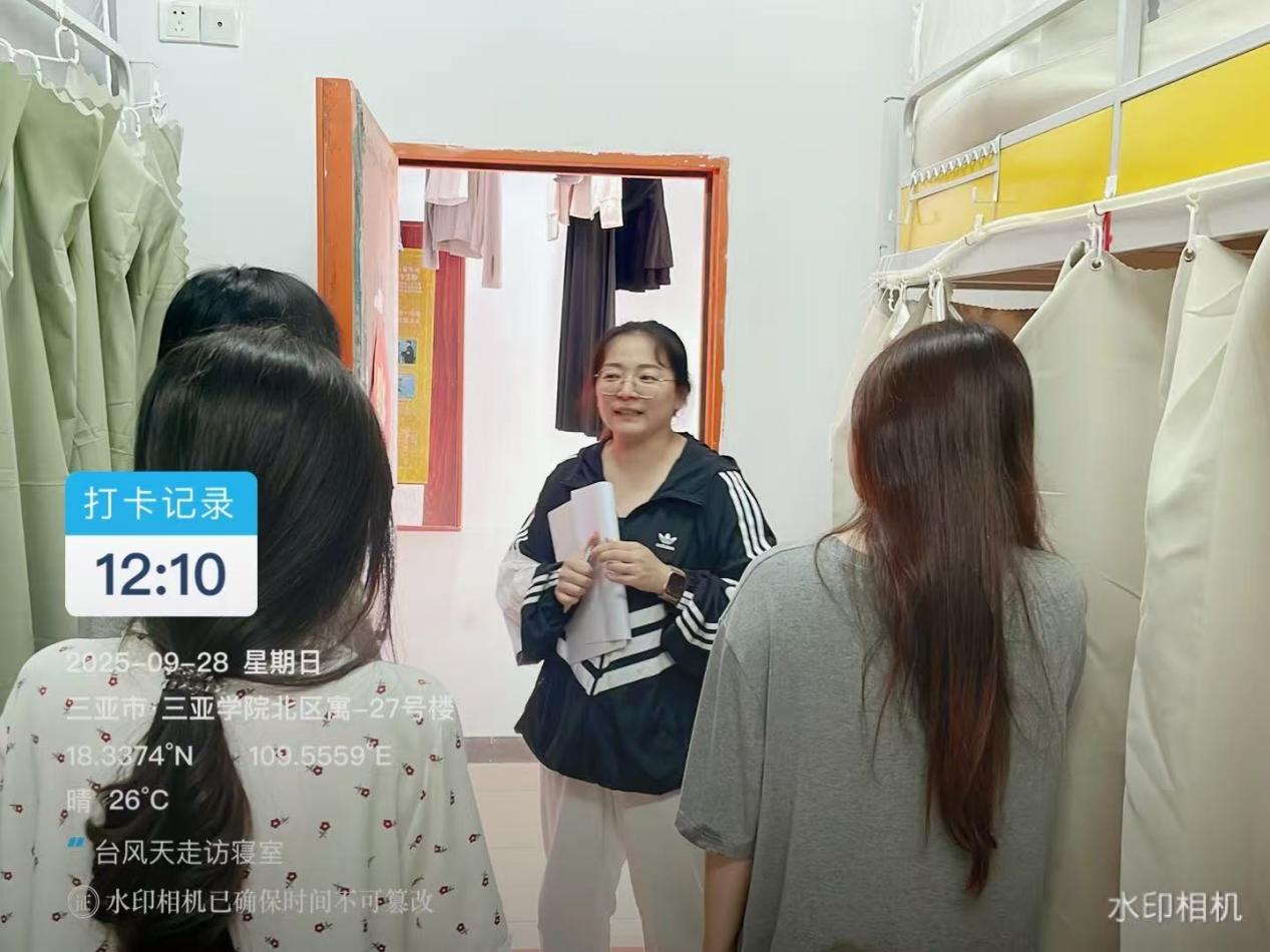 随着国庆假期临近,叠加台风 “博罗依” 带来的极端天气影响,为切实保障学生假期安全与校园稳定,9月28日,三亚学院管理学院学工团队提前部署、主动作为,深入学生宿舍开展国庆假期前专项走访活动。通过逐间排查安全隐患、精准开展安全教育、贴心提供假期指导等举措,将安全防护网织密织牢,为全体学子度过一个平安、有序的假期保驾护航。