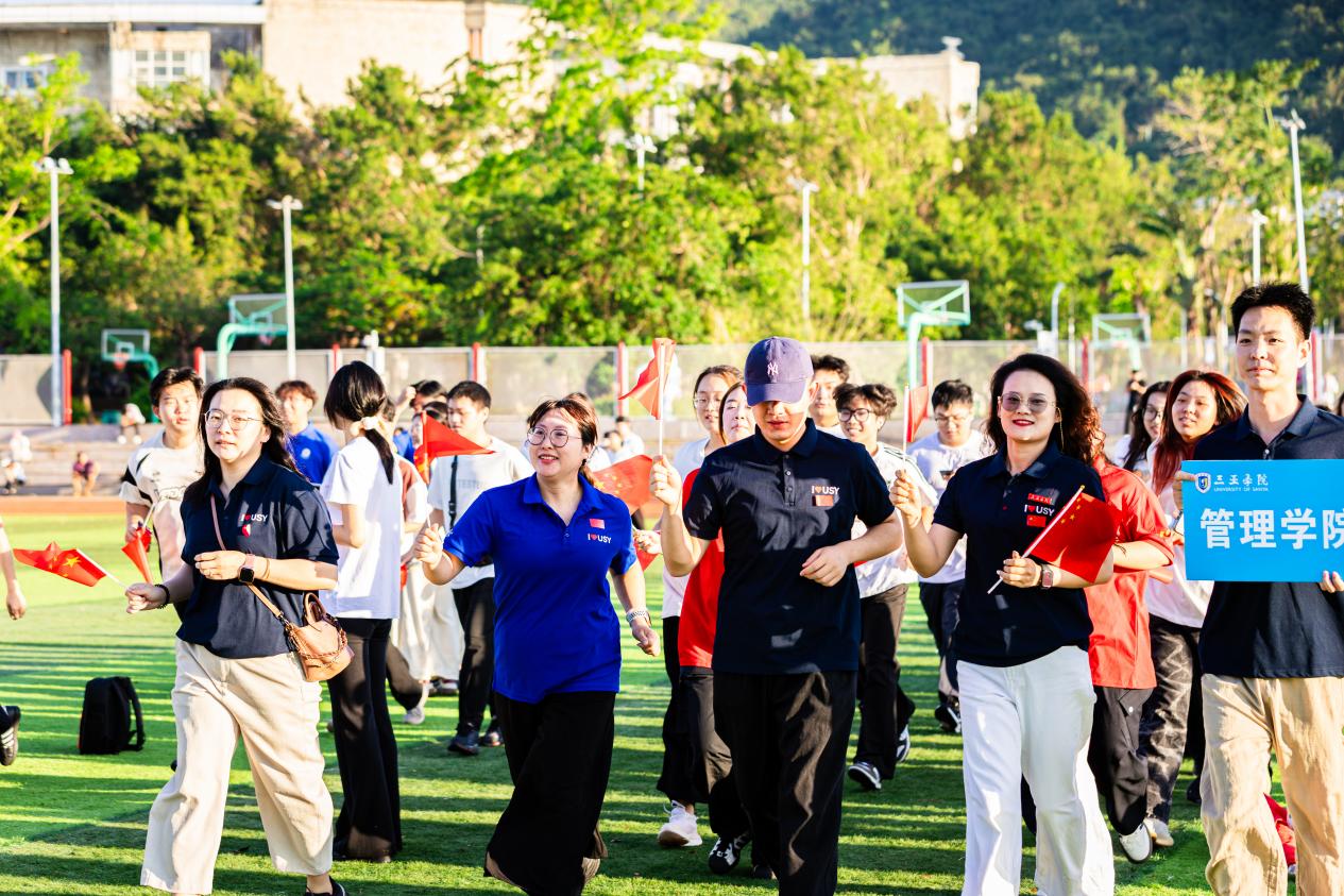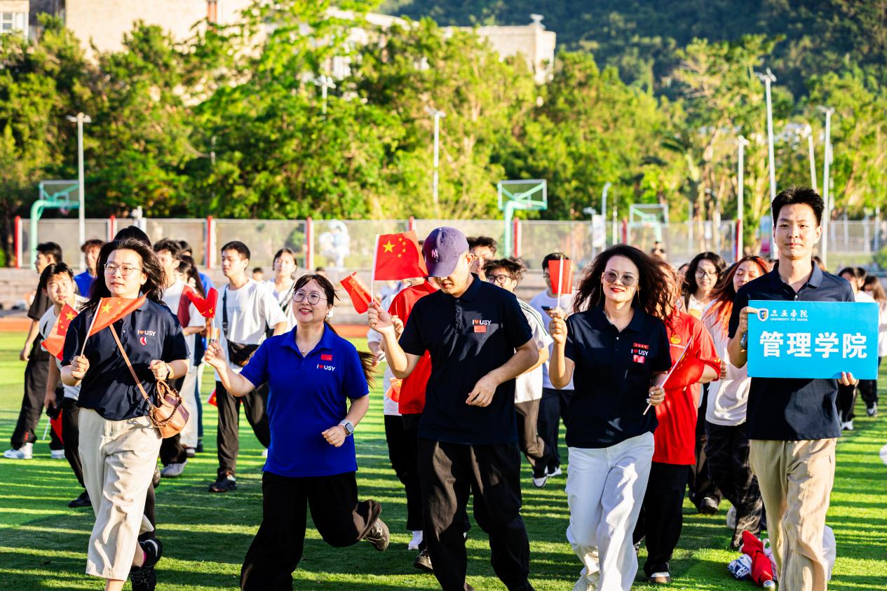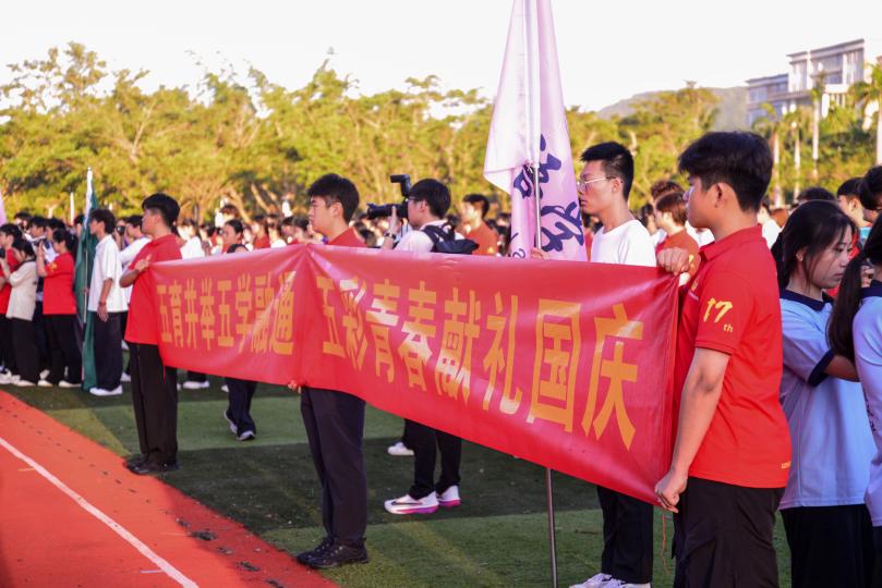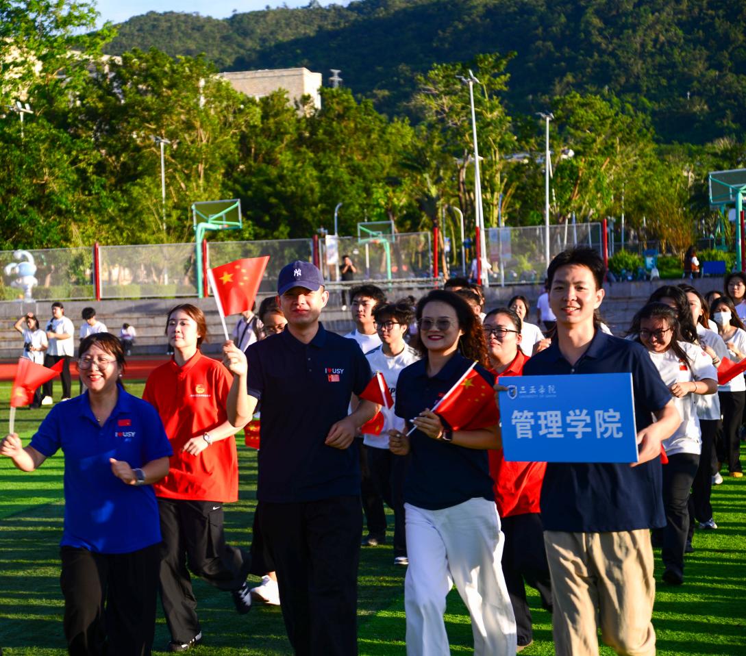 10 月 1 日清晨 7 时,三亚学院风雨操场内旌旗飘扬,千余名师生齐聚于此,隆重举行庆祝中华人民共和国成立 76 周年升旗仪式。管理学院师生代表身着整齐服装,与全校师生共同见证这一庄严时刻,抒发爱国情怀。
