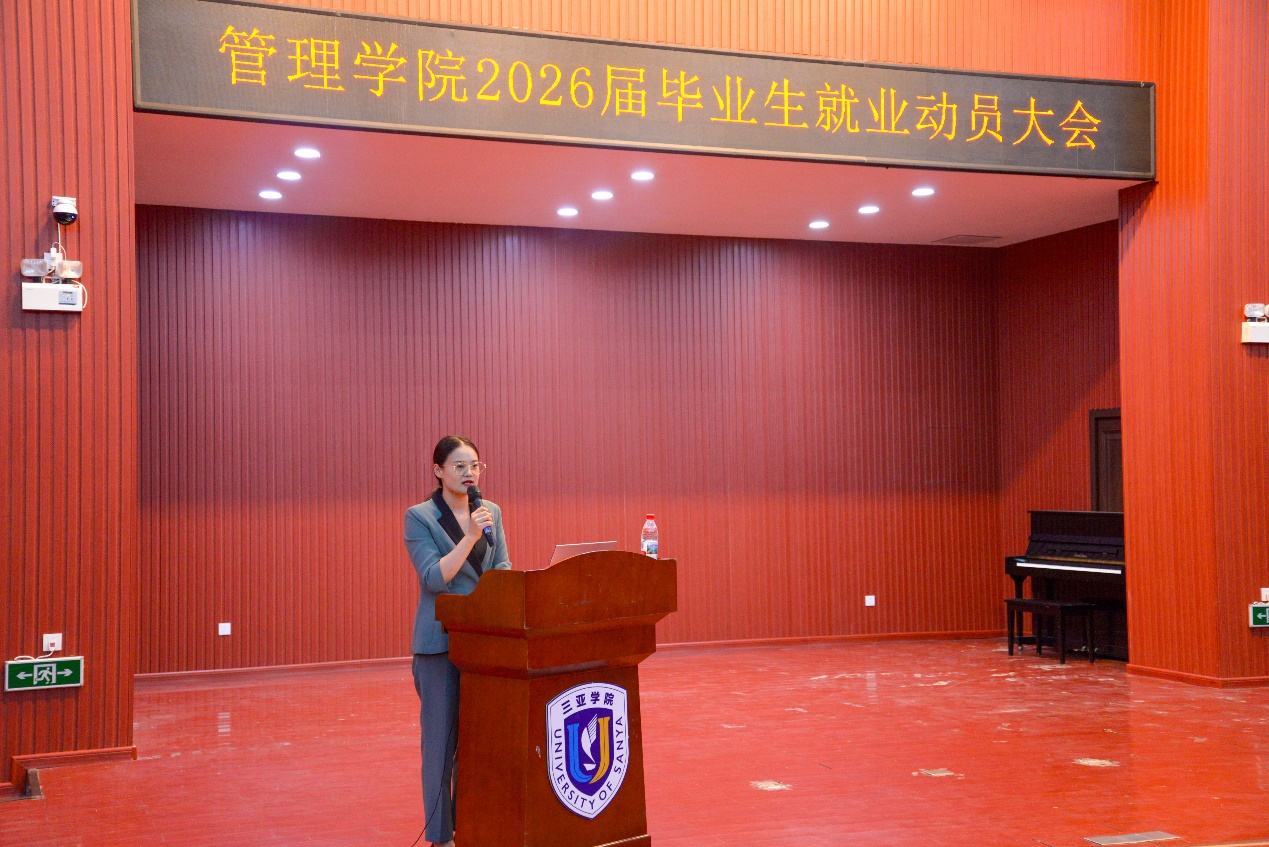 10月20日晚,三亚学院管理学院2026届毕业生就业动员大会在书会堂隆重举行。管理学院院长王云凤、党总支副书记陶信伟、院长助理张成甦、团委副书记王娜、毕业班思想导师、学业导师与全体2026届毕业生齐聚一堂,共同开启职场筹备新征程。大会由团委副书记王娜主持。