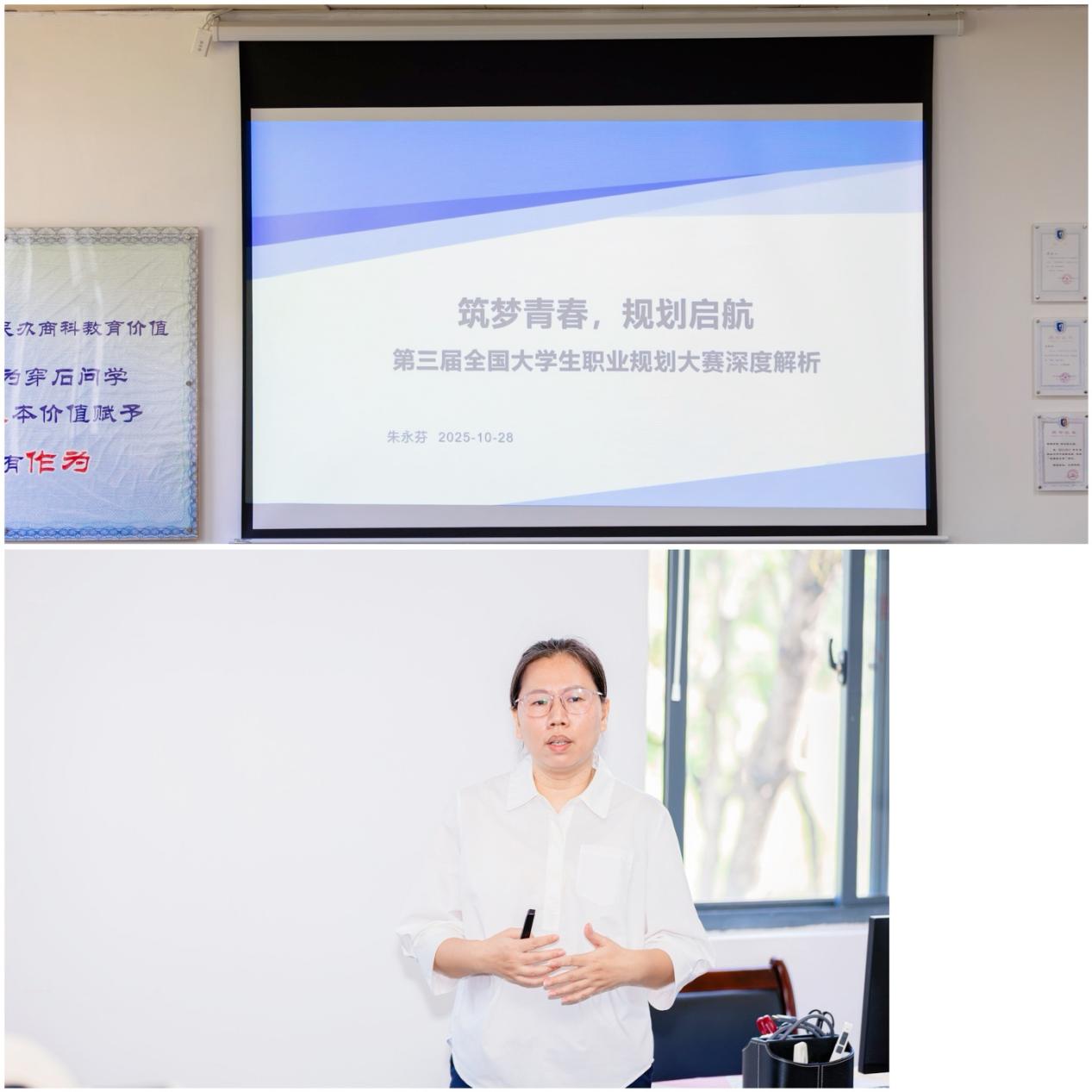 随后,朱永芬老师以“是什么、为什么、怎么做”为核心逻辑脉络,为学生带来系统性备赛指导。她以本次大赛主题为切入口,精准拆解大赛双重赛道的核心差异:成长赛道侧重职业发展潜力与规划逻辑性,就业赛道聚焦岗位适配度与实操能力,帮助学生根据自身情况科学择赛道。针对评审标准,朱老师深入剖析成长赛道“职业目标学习实践行动优化改进三个关键得分点和就业赛道“职业目标、岗位胜任力、发展潜力”三大关键得分点,结合往届国赛、省赛优秀案例具象化解读评分细则;同时紧扣赛事节奏,提出“基础准备期、深化打磨期、冲刺优化期”备赛三阶段规划,为学生提供可落地的时间管理方案。