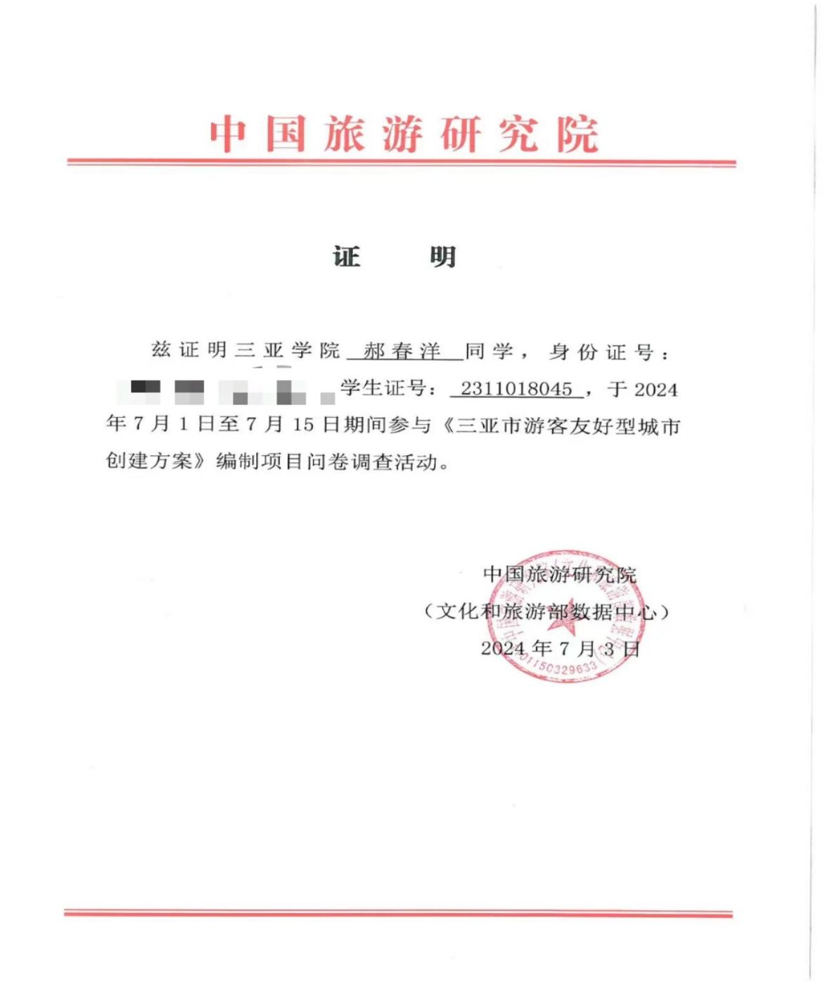 在中国旅游研究院(文化和旅游部数据中心)《三亚市游客友好型城市创建方案》调研项目中,他积极配合团队推进线下调研工作,主动深入三亚热门景区、城市商圈及游客集散点,针对不同客源地、年龄段游客耐心开展问卷发放与街头访谈,全力配合完成调研任务,累计协助搜集有效数据近三百条,为项目的数据储备提供了切实支持。