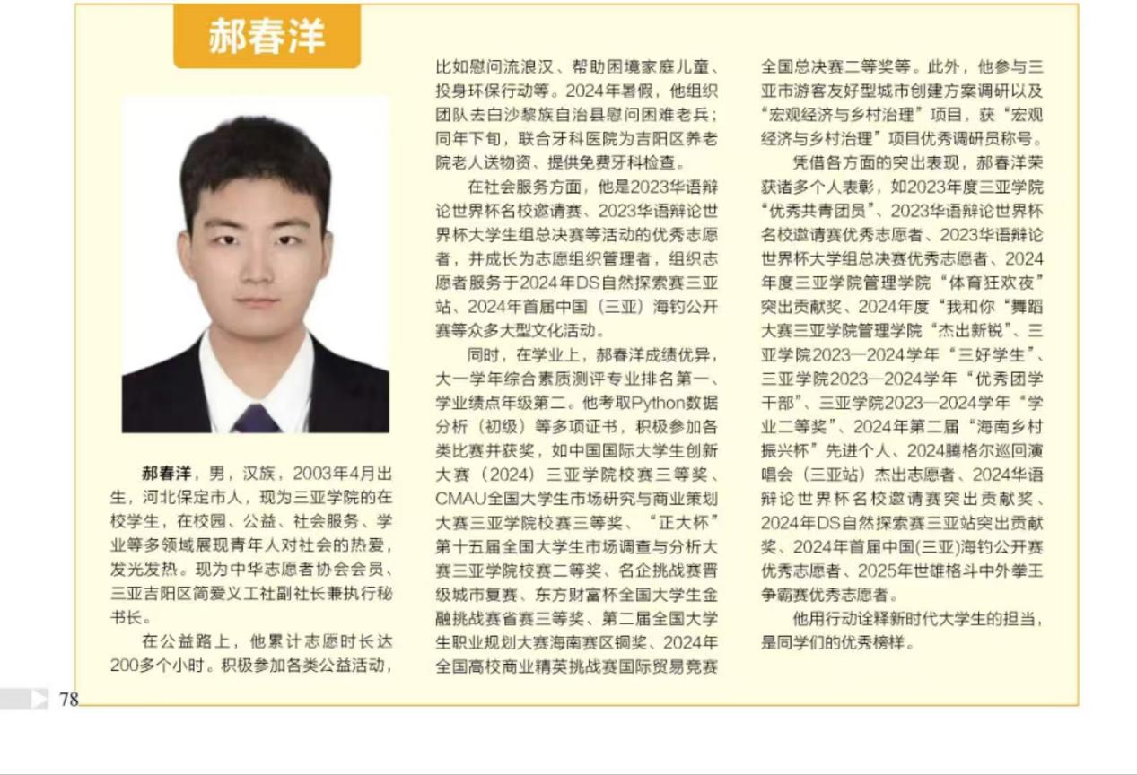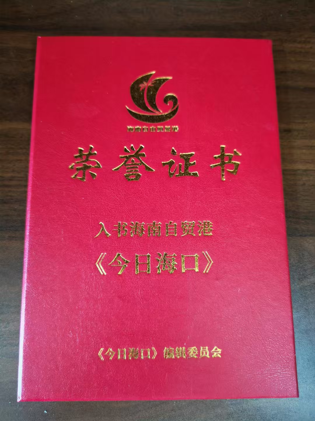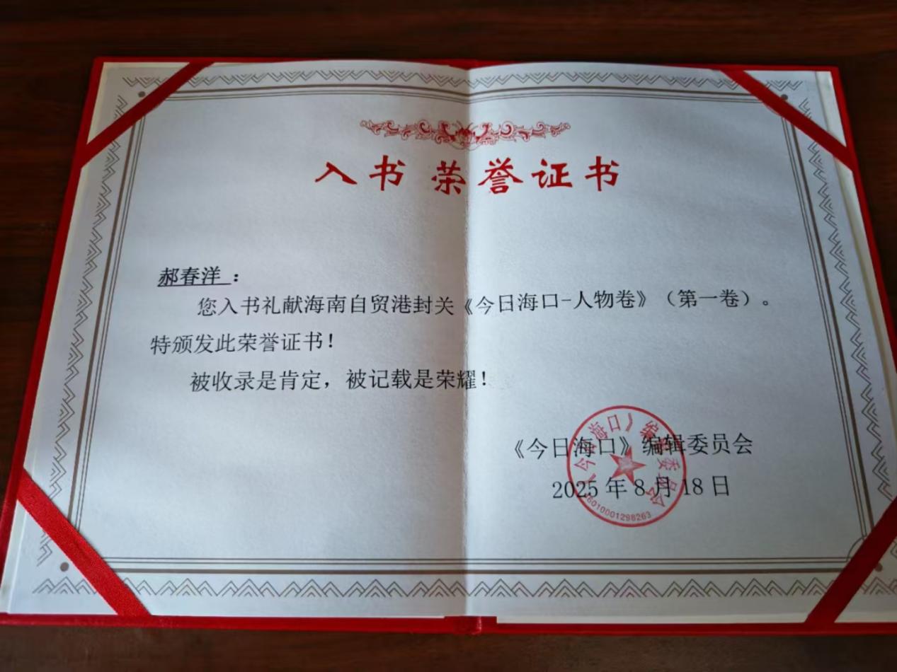 郝春洋不仅在创新创业领域表现亮眼,还凭借突出的实践成果获得了行业的高度认可。2025年8月18日,他被收录进礼献海南自贸港封关的《今日海口-人物卷》第一卷,获《今日海口》编辑委员会颁发的入书荣誉证书,这份肯定也印证了他在助力地方经济社会发展、传承海南传统文化创新等方面取得的卓越成就,是三亚学院青年学子扎根实践,绽放人生价值的生动缩影。