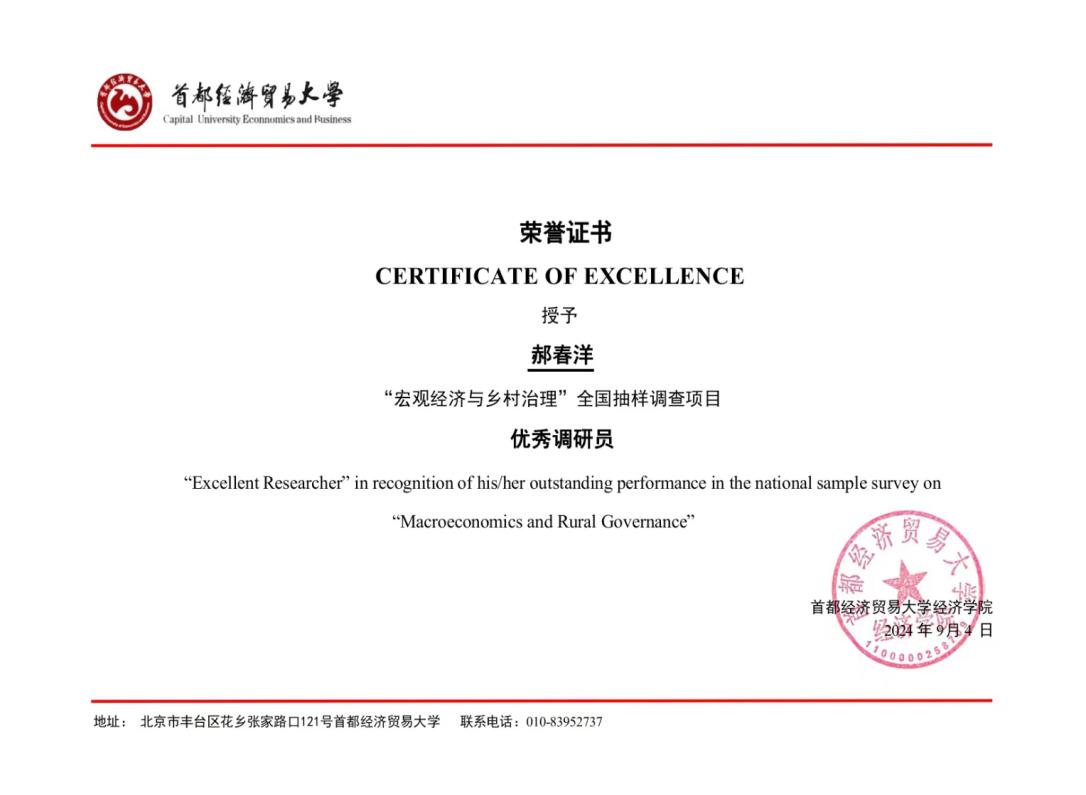 在中国农业农村部委托给首都经济贸易大学的“宏观经济与乡村治理”项目中,他认真配合调研团队深入基层开展实地工作,按要求完成各项指定任务,积极做好信息收集与反馈,以严谨负责的态度配合团队推进项目落地,凭借良好的工作表现获评“优秀调研员”。这些学术调研经历,让他积累了丰富的实地实践经验,为后续的项目策划与创业探索打下了坚实基础。