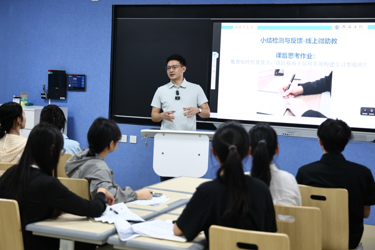 课程尾声,微助教平台自动生成学习成效报告,欧阳元老师结合报告进行个性化点评,同时围绕“个体层面如何参与学习型组织建设”,强调要做到“拥抱变革、系统思考”“知识输入·加工·输出闭环”等关键行动。课后,他布置了“数智化时代背景下,团队视角下如何有效构建学习型组织?”的思考作业,实现课堂学习的延伸与深化。