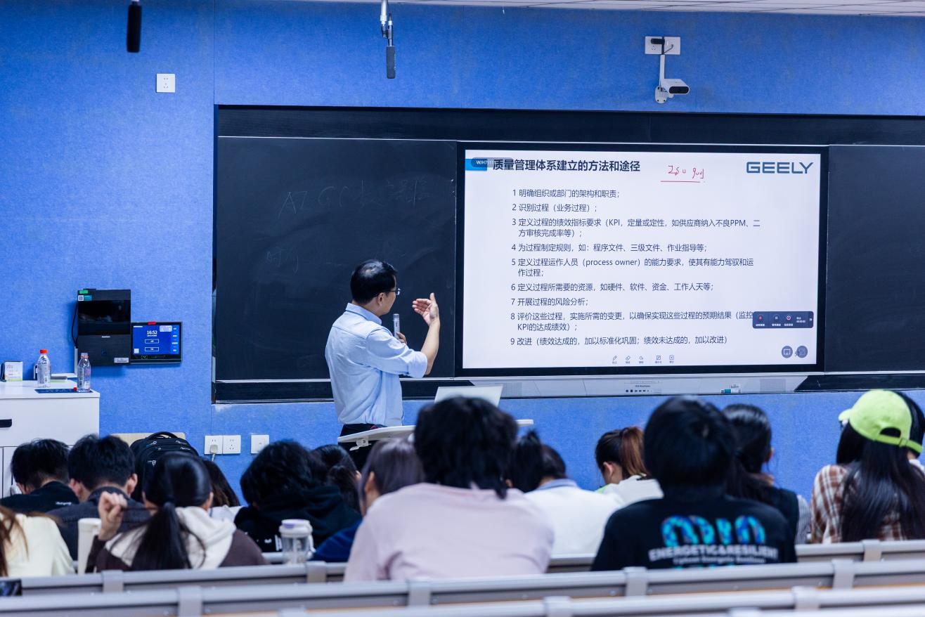 1月4日14:30,在5东101,吉利行业专家吴建华先生莅临我院,为工商2301班的大三学生开展冬季短学期《汽车供应链质量管理》系列课程。本次课程以“质量管理理论与企业实践”为核心,旨在通过系统性的理论讲授、国际标准解读与真实案例分析,助力学生构建扎实的质量管理知识体系,从容应对AI时代下的职业挑战。