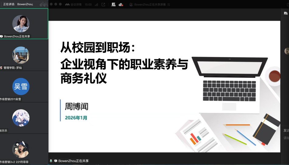 1月6日晚,经济学博士、国际特许金融分析师(CFA)持证人、硕士生导师周博闻副教授应邀为管理学院市场营销2511班学生开展了一场主题为《从校园到职场:企业视角下的职业素养与商务礼仪》的线上专题讲座。本次讲座旨在帮助新生提前了解职场要求,树立职业发展意识,搭建从校园学习到职场实践的桥梁。