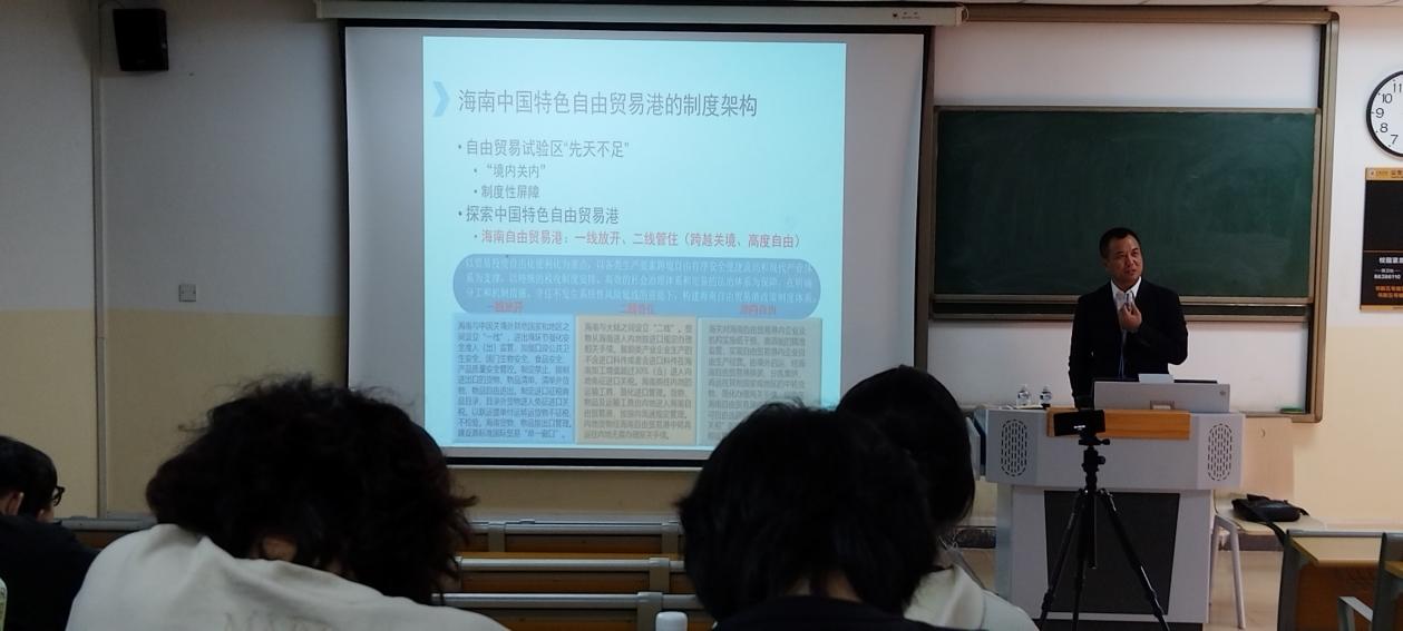 报告主要从海南自贸港建设的政策缘起、基本内涵、发展历程、国际经验及海南探索几个方面展开。在政策缘起方面,张教授带领大家回顾了习近平总书记《在庆祝海南建省办经济特区30周年大会上的讲话》和《中共中央国务院关于支持海南全面深化改革开放的指导意见》,进一步引导大家明确党中央国务院对海南的发展定位。张教授结合世界经济发展的历史经验和我国改革开放进入深水区的现实背景,运用详细的图表和数据给大家分析了党中央国务院选择在海南建设中国特色自由贸易港的深层次原因,同学们表示受益匪浅。在基本内涵方面,张教授带领大家学习了自由港、自由贸易港和中国特色自由贸易港的渊源、联系和区别,详细分析了中国特色自由贸易港的本质特征和制度框架。随后,报告对自由贸易港的发展历程、国际知名自由贸易港的建设经验和海南在中国特色自由贸易港建设方面的实践探索进行了解读。