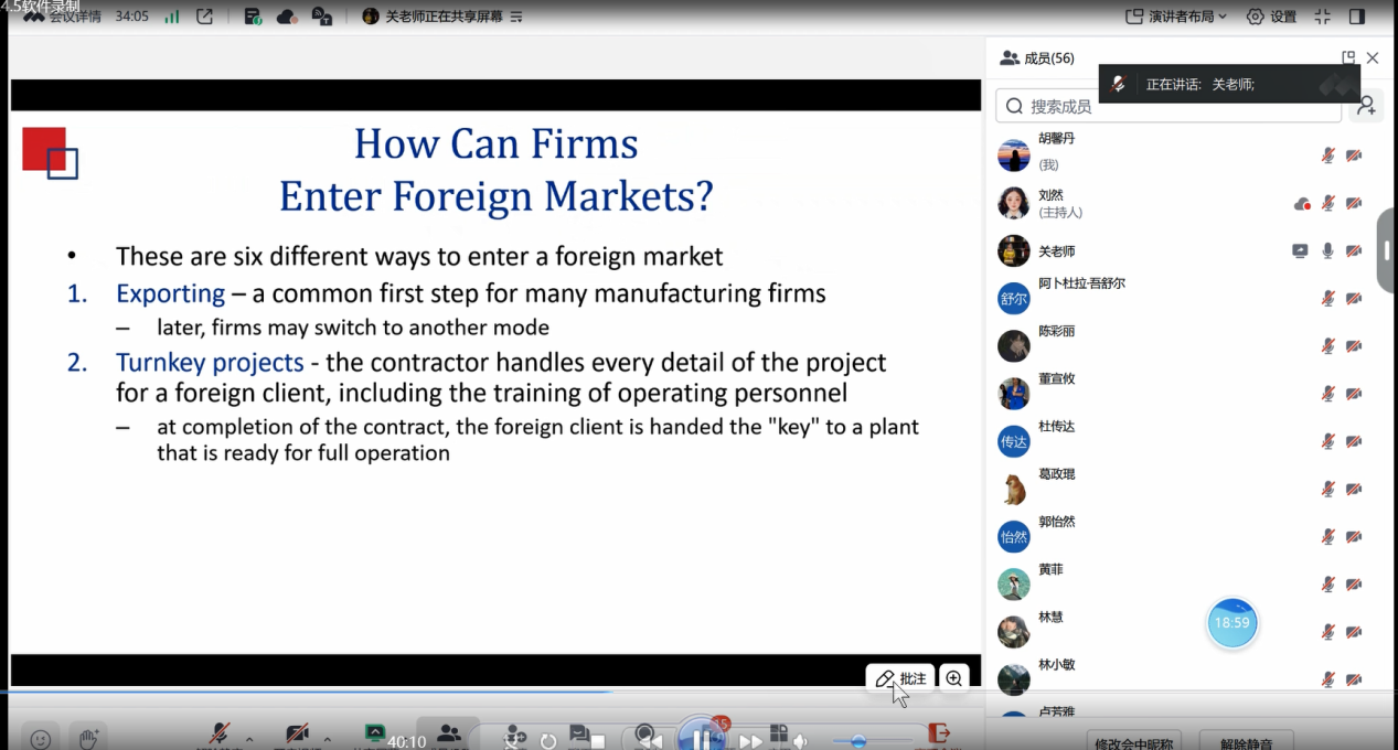 针对影响进入决策的关键因素,关教授从外部与内部方面进行拆解,外部聚焦运输成本、贸易壁垒、政治及经济风险,内部则强调企业自身发展战略的核心导向作用。在市场进入模式方面,他详细分析了出口、许可贸易、特许经营、合资经营、全资子公司及并购六种主流模式的利弊,为学生根据企业资源与目标选择适配路径提供了清晰指引。