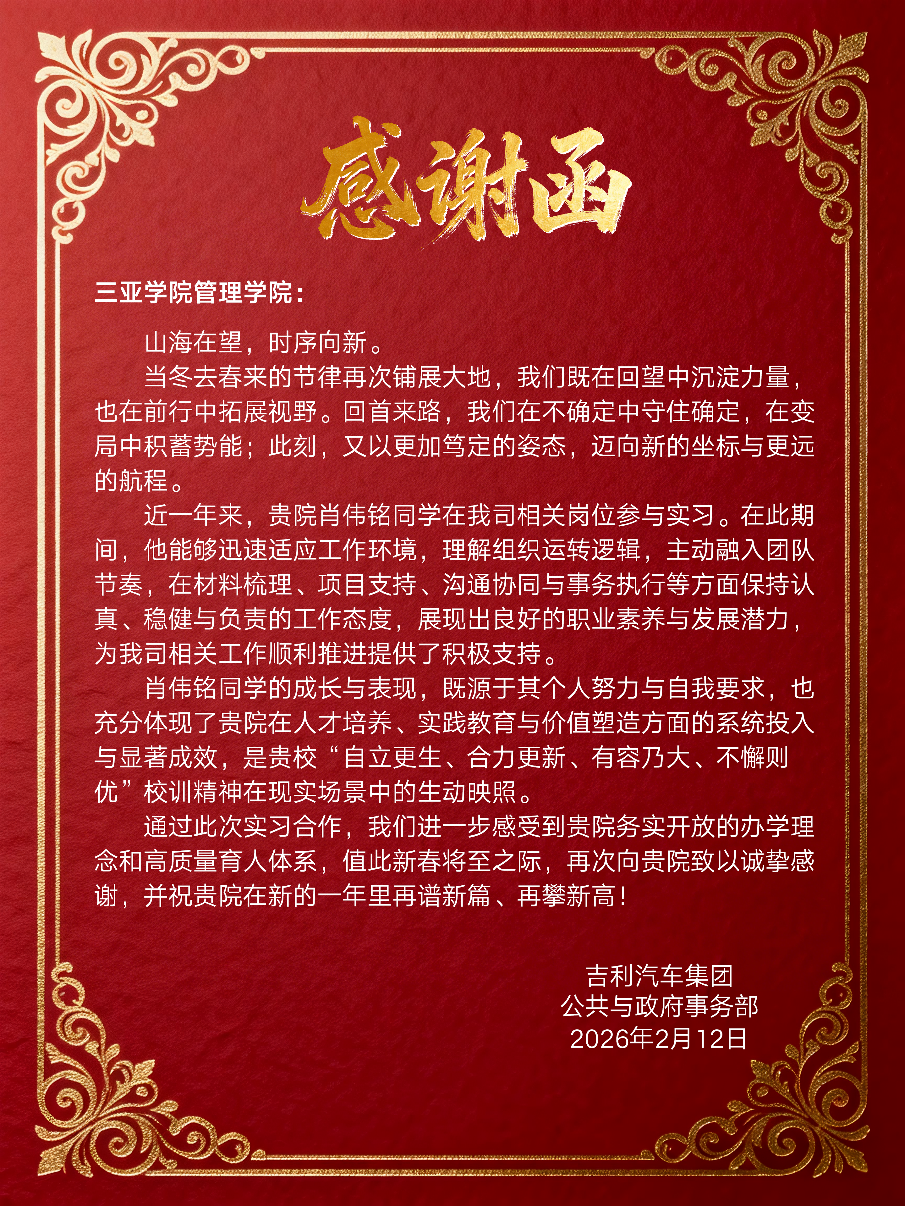 新春将至,捷报频传。2月12日,三亚学院管理学院收到来自吉利汽车集团公共与政府事务部的一封暖心感谢信,信中对管理学院2026届工商管理专业学子肖伟铭在实习期间的优异表现给予高度评价,同时,对管理学院的人才培养质量和实践育人成效表达了由衷赞赏。这封感谢信既是校企协同育人成果的又一生动彰显,也是管理学院落实“三个校园”建设的扎实体现。