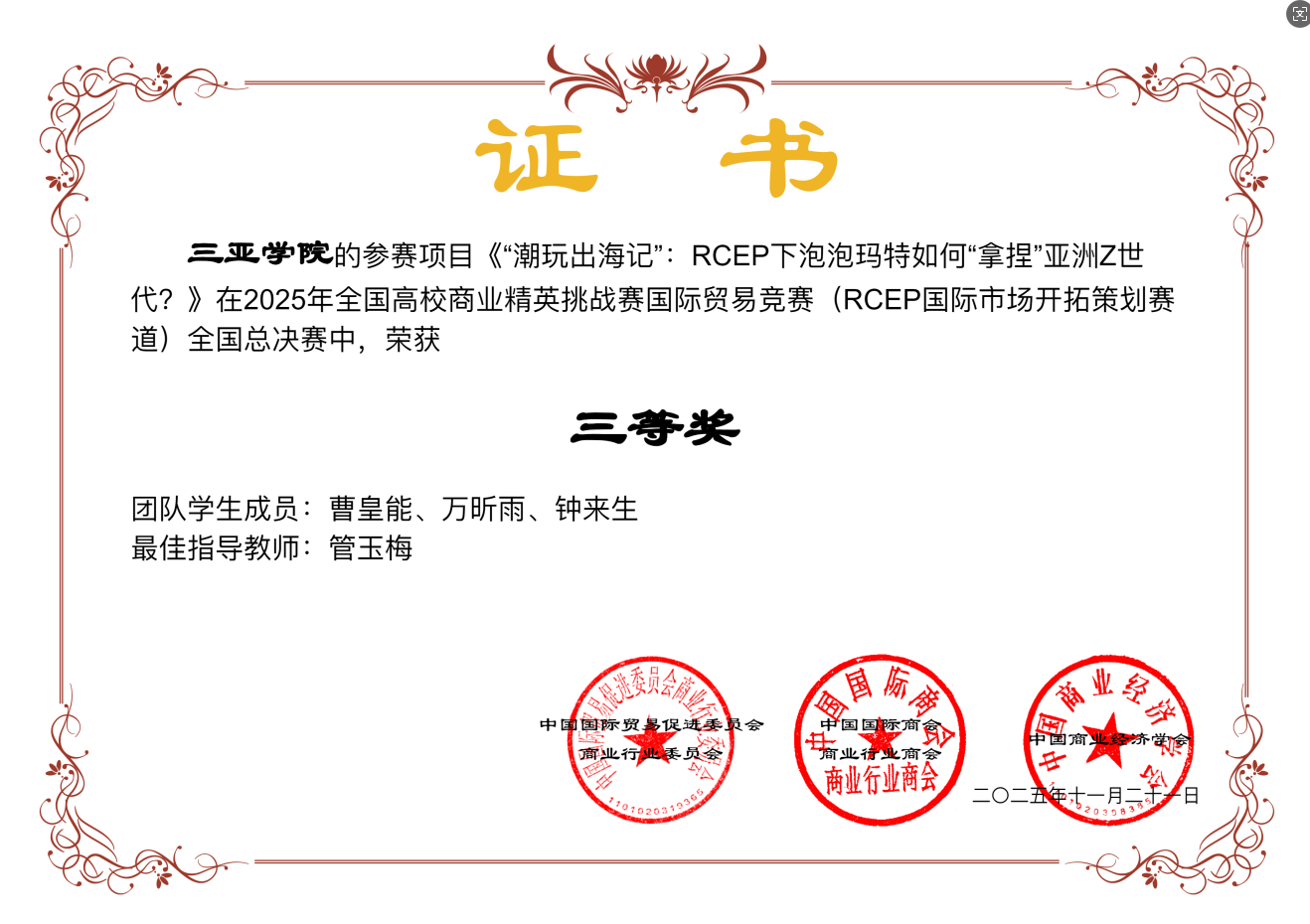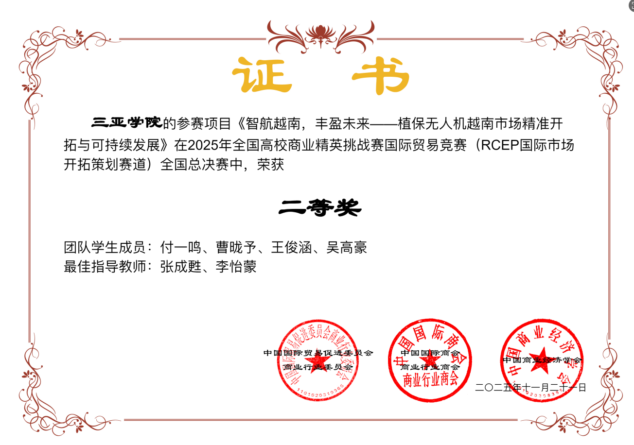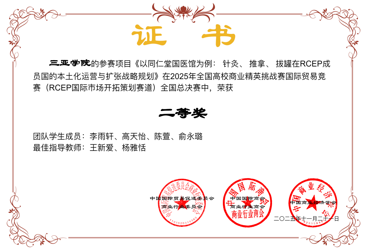 学科竞赛屡获佳绩:2025年5月,在全国高等院校数智化企业经营沙盘大赛海南省(本科组)选拔赛中,学子凭借扎实的专业功底与出色的团队协作,斩获省级二等奖1项、三等奖2项,充分展现数字化管理能力;2025年11月,在2025年全国高校商业精英挑战赛国际贸易竞赛全国总决赛中,工商管理专业李雨轩、高天怡、陈萱、俞永璐、吴高豪、曹皇能、万昕雨等学子斩获全国性二等奖、三等奖等奖项,充分展现国际视野与实战能力。