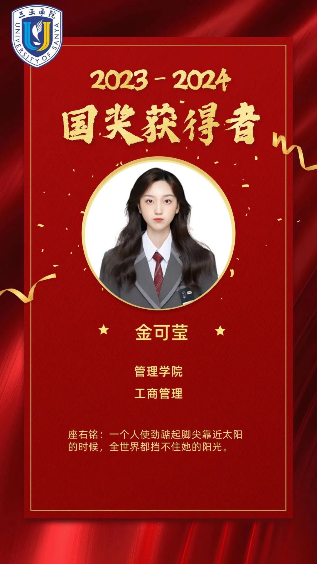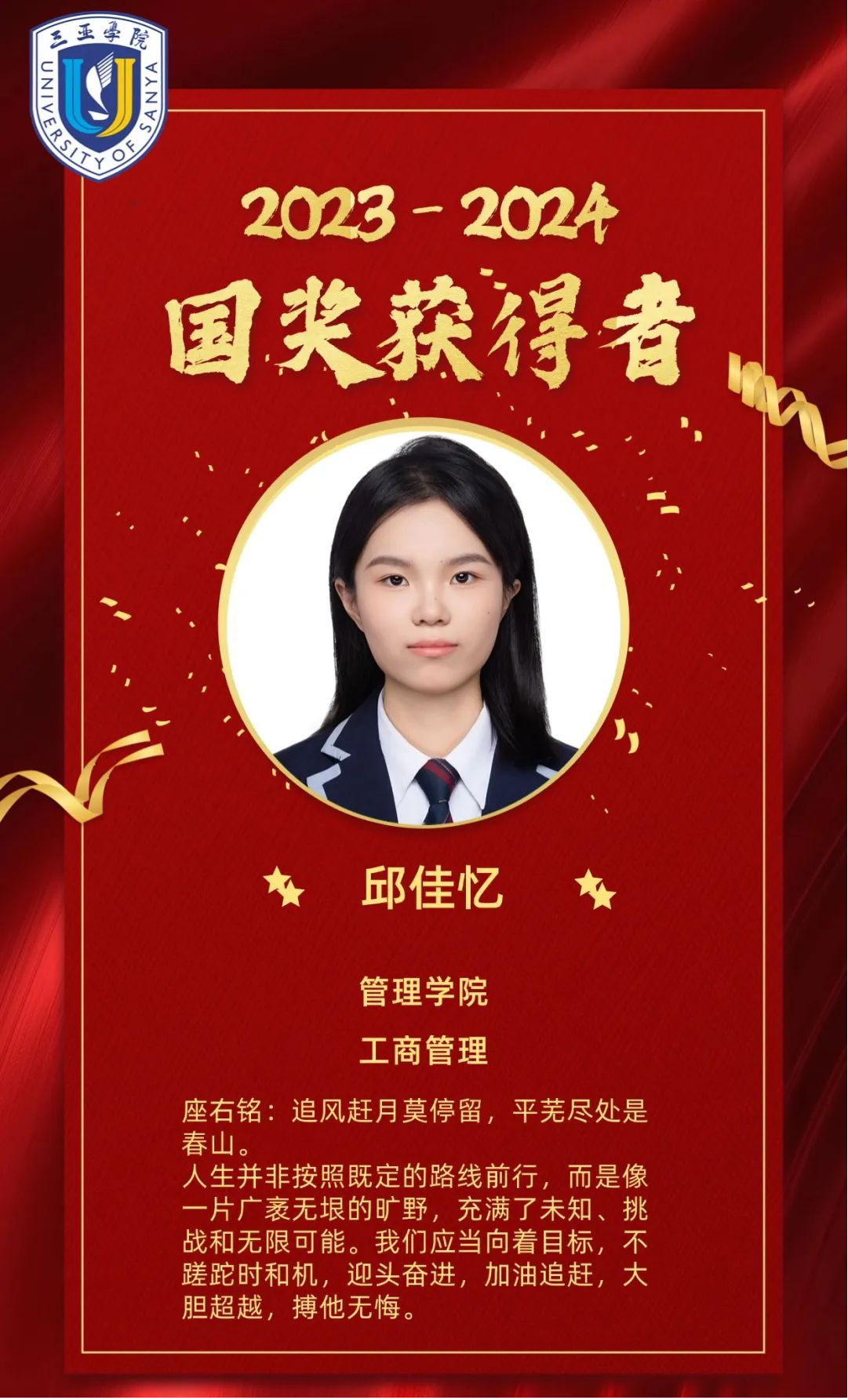 荣誉表彰树立标杆:工商2101班邱佳忆、工商2201班金可莹(2023-2024学年)、工商2301班吴高豪(2024-2025学年)先后荣获国家奖学金,以优异的学业成绩、丰富的实践经历成为全体学子的学习典范。