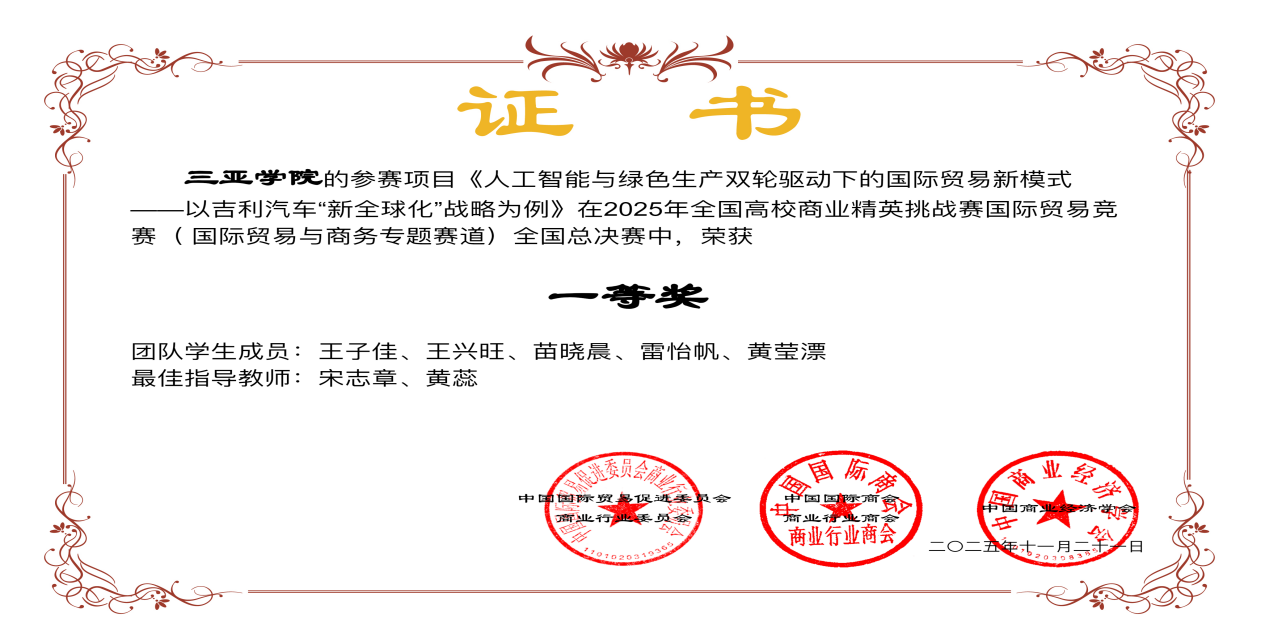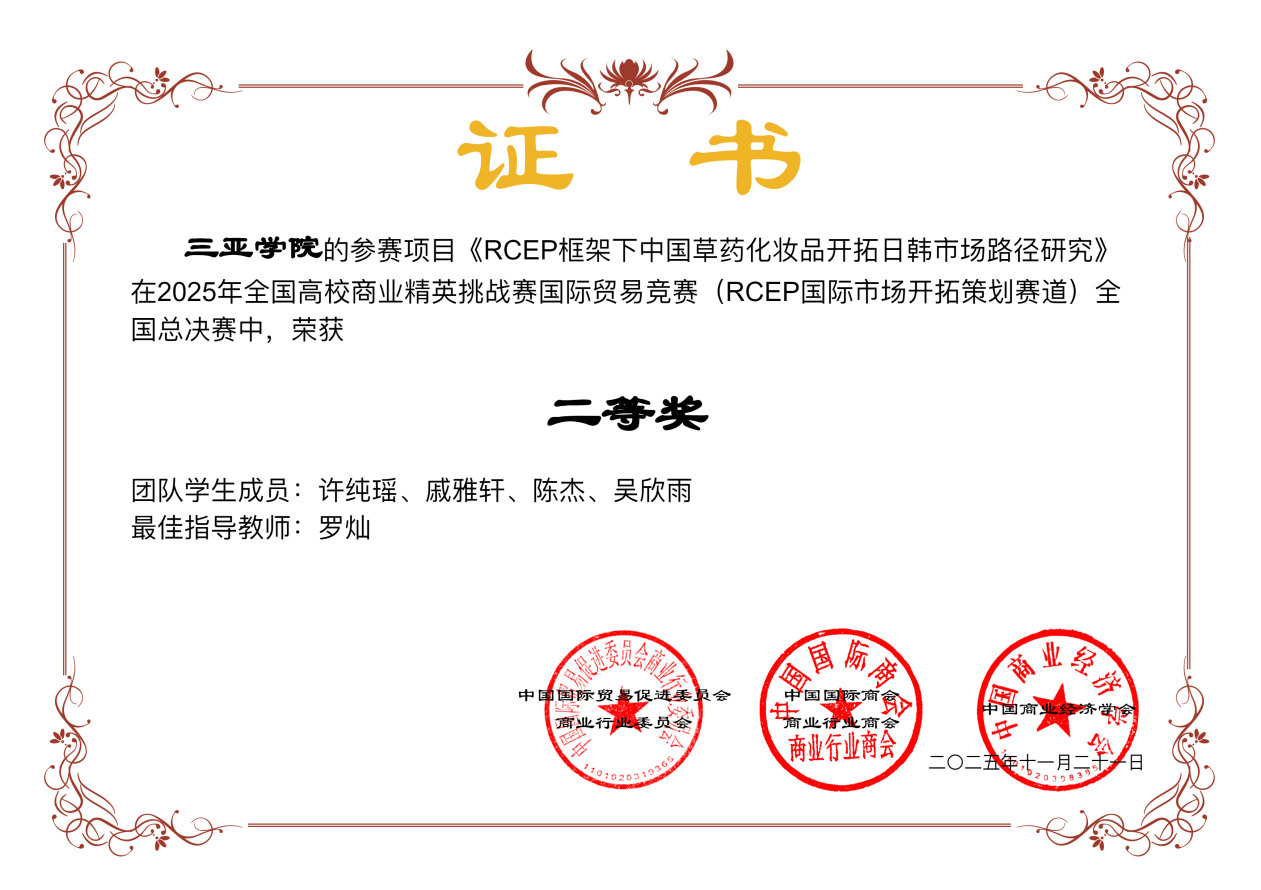 人力资源管理专业王子佳、王兴旺等五位学子在2025年全国高校商业精英挑战赛国际贸易竞赛(国际贸易与商务专题赛道)全国总决赛中荣获一等奖,许纯瑶、戚雅轩等学子在该赛事RCEP国际市场开拓策划赛道全国总决赛中荣获二等奖,展现了扎实的专业素养。