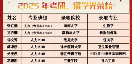 人力资源管理2025届毕业生中,张在茹、焦雯卿、杨文源等学子凭借优异表现,成功考取国内高校及海外院校研究生;王琛钰成功入职中铁建工集团第一建设有限公司,升学、就业双丰收,为学院人才培养再添硕果!